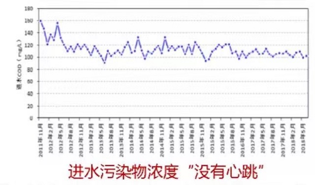 “污水處理廠的進水濃度也應該進行調查,因為從這個指標入手,我們可以初步判定整個污水收集系統外水入滲的程度,還要包括旱天、雨天水量變化和溢流量調查。”唐建國同時以圖片舉例,如果污水處理廠的進水污染物濃度沒有“心跳”,進水水質基本恒定在一條直線上,就可以判斷出它的進水濃度有問題。