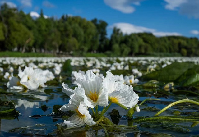 在云南大理洱海,海菜花正連片綻放,微風(fēng)搖蕩,薄薄的白色花瓣如同水晶般晶瑩剔透,與鵝黃的花蕊一同一顫一顫兒地?fù)u曳起來,遠(yuǎn)遠(yuǎn)望去,似雪非雪卻勝雪。