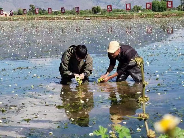 因此,在9年前,洱海治理團(tuán)隊(duì)就“看上”了海菜花,他們用幾年的時(shí)間研究,將海菜花從湖里邊撈起來,像插水稻一樣種在農(nóng)田里,喜獲成功,經(jīng)過七八年努力,種植面積達(dá)到了幾千畝。但它的前提條件是——水必須是清澈的好水。