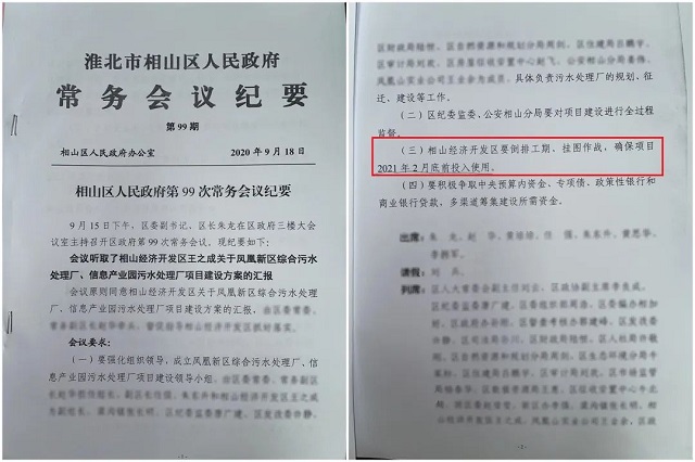 偏偏相山區一點也不急,嘴上喊著已經在走流程了,其實是2020年9月才研究部署食品工業園污水處理廠建設工作,并且相關工作僅停留在文件上,直至本次督察進駐前夕,相山區才再次啟動污水處理廠的建設工作,目前尚處于項目土地報批階段。