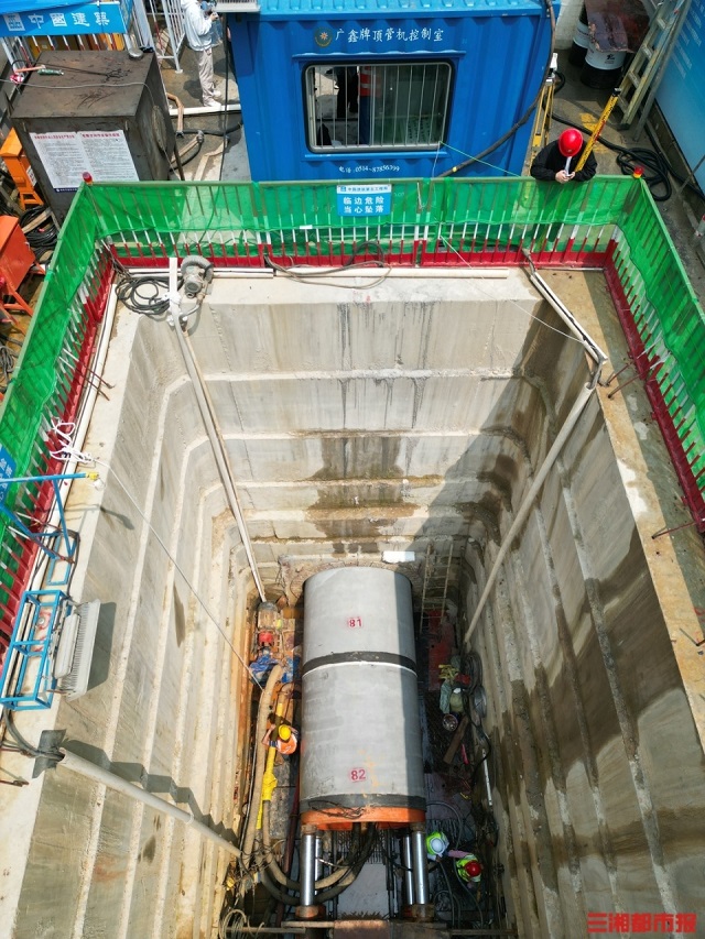 由長(zhǎng)沙市芙蓉區(qū)朝陽(yáng)路的一處圍擋而入,映入眼簾的是一處深基坑工作井。井深10米,井底有一條直徑2米、長(zhǎng)267米的管道正在施工。三湘都市報(bào)記者隨后系上安全帶,佩戴防墜器,沿著梯子向下來(lái)到管道口。路面之上,車水馬龍,10米之下,只能隱約能聽(tīng)到管道內(nèi)作業(yè)人員施工的聲音。