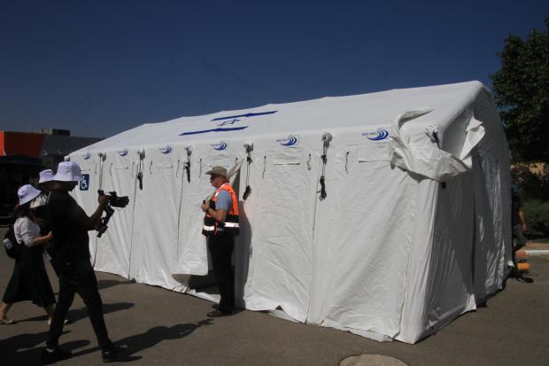展示應(yīng)急衛(wèi)生系統(tǒng)帳篷的搭建