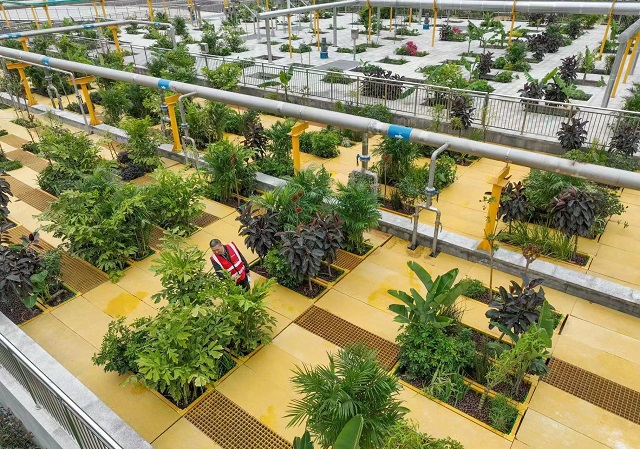 從空中俯瞰,散尾葵、芭蕉、鳶尾等47種植物共5300余株水生植物,有規(guī)律地分布在約3000平方米的食物鏈反應(yīng)器頂部。鵝黃色的花朵、郁郁蔥蔥的綠葉,儼然一幅花園美景。但與天府新區(qū)第一再生水廠上的景觀公園不同的是,彩云湖污水處理廠的植物起到了更為重要的降解作用。