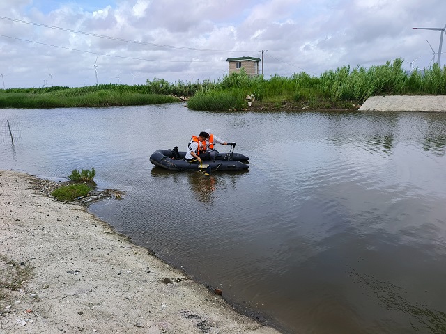 圖為太湖東海局監(jiān)測與科研中心工作人員乘皮劃艇搭載側(cè)掃聲吶排查水下排污口
