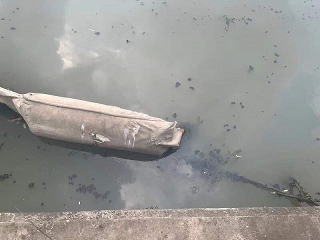 在他的指引下,記者前往該河段查看詳情。臭味正是源自一段長約20米、寬約16米的斷頭河,河道被岸邊整整齊齊的石磚圍成了一塊方形區(qū)域,內(nèi)里的河水幾乎看不到流動,上面還漂浮著大片大片的黑色物質(zhì),越靠近臭味愈發(fā)難聞。記者在一旁的綠化帶內(nèi)找了根樹枝,想看看黑色物質(zhì)到底是什么,沒想到一碰觸,黑色物質(zhì)馬上散開在了水中。似乎是為了防止黑色物質(zhì)的擴散,這段“盲腸”和北竹港大河的交界處用一排防污簾做了物理分隔,不過,阻截的措施并不嚴密,在靠北的區(qū)域還留有一個缺口,大量的黑色物質(zhì)順著缺口,流向大河流域。