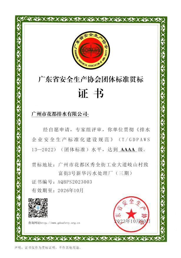 廣州水投花都排水公司獲得排水企業安全生產標準化AAAA級證書