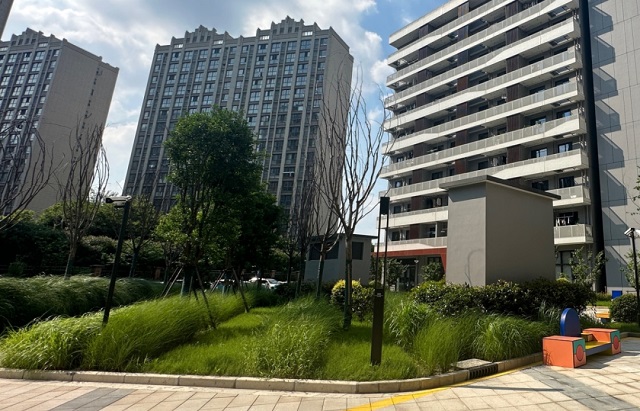 這一項目遵循“社區+海綿”理念,綜合景觀效果和場地條件,選用適宜的海綿城市技術措施,形成“透水鋪裝、植草溝引流+生物滯留設施消納”的雨水徑流組織形式,并加入雨水回用設施,優化場地雨水排水條件,減少地面徑流,強化蓄水能力,控制污染物外排,增加雨水回收利用,實現水安全、水環境、水生態、水資源等4方面協同提升。