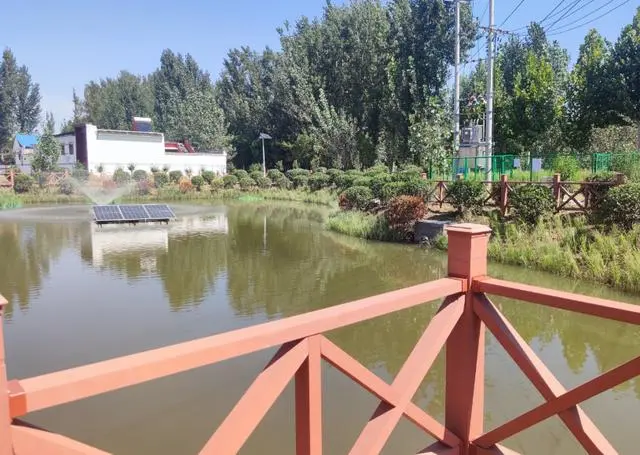 蘇玥心是劉莊村的網(wǎng)格員,她每天都會(huì)到池塘旁巡視,確保沒(méi)有污水流進(jìn)池中,并在發(fā)現(xiàn)垃圾后及時(shí)清理。“噴泉是由太陽(yáng)能進(jìn)行發(fā)電,節(jié)能環(huán)保。池中還養(yǎng)殖著魚(yú)類,起到凈化水質(zhì)、監(jiān)測(cè)水質(zhì)的作用?!碧K玥心說(shuō),在夏季雨水較多時(shí),她會(huì)增加巡查次數(shù)。“發(fā)現(xiàn)污水排入或是池中有垃圾時(shí),我會(huì)進(jìn)行清理和上報(bào),相應(yīng)的工作人員都會(huì)及時(shí)響應(yīng),守護(hù)這來(lái)之不易的清澈?!彼f(shuō),如今這里空氣濕潤(rùn)清新,每天傍晚都有不少村民到此散步休閑。