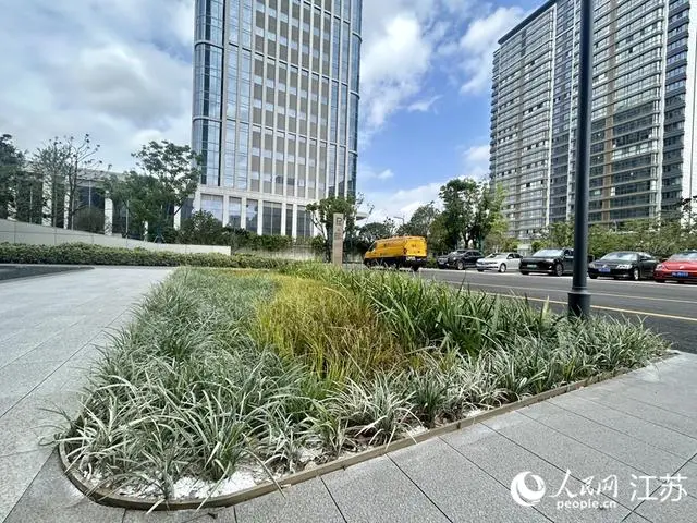 走進揚州建工科技園內的綠地,會發現一些高出植物的黑色噴頭,這是與雨水回收系統聯動的自動灌溉系統。這塊吸滿了水的大“海綿”,不僅可以緩解城市熱島效應,增加地塊的生態調蓄功能,還將滯留和凈化后的雨水用于園區綠化澆灌和道路噴灑。