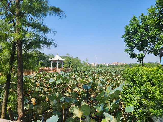 在潮陽金浦梅花濕地,棧道、涼亭、荷花、白鷺與周圍的稻田串聯成一幅美輪美奐的生態畫卷。