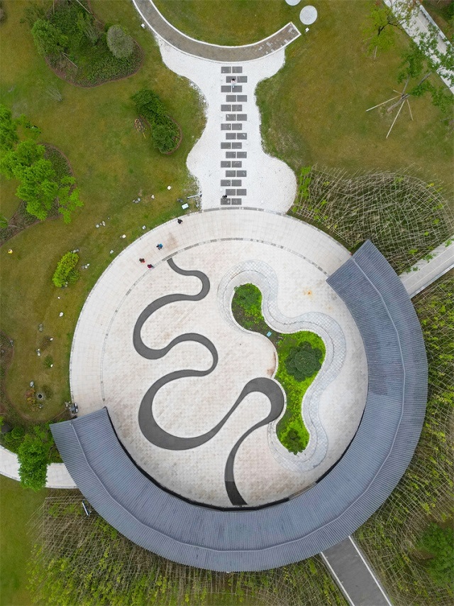 來到文博公園山頂,圓弧形風(fēng)雨連廊形成一個圈,圈里是“海綿+文化”的巧妙融合而形成的標(biāo)志性景點——曲水流觴。風(fēng)雨連廊房頂斜坡的雨水,從屋檐滴落到碎石帶上,經(jīng)過消能、凈化后,匯入蓄水池。