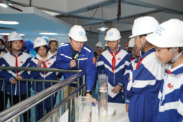 深入地下五層來(lái)到再生水廠,猶如走進(jìn)一座“地下迷宮”,滿眼盡是彎彎折折的地下廊道。學(xué)生們走進(jìn)地下水廠后,先后參觀了展廳、中控室、預(yù)處理區(qū)、生化池區(qū)、MBR膜池區(qū)和尾水池等區(qū)域,近距離觀察了其中的污水處理相關(guān)裝置,并跟隨講解員了解其中的科學(xué)原理。
