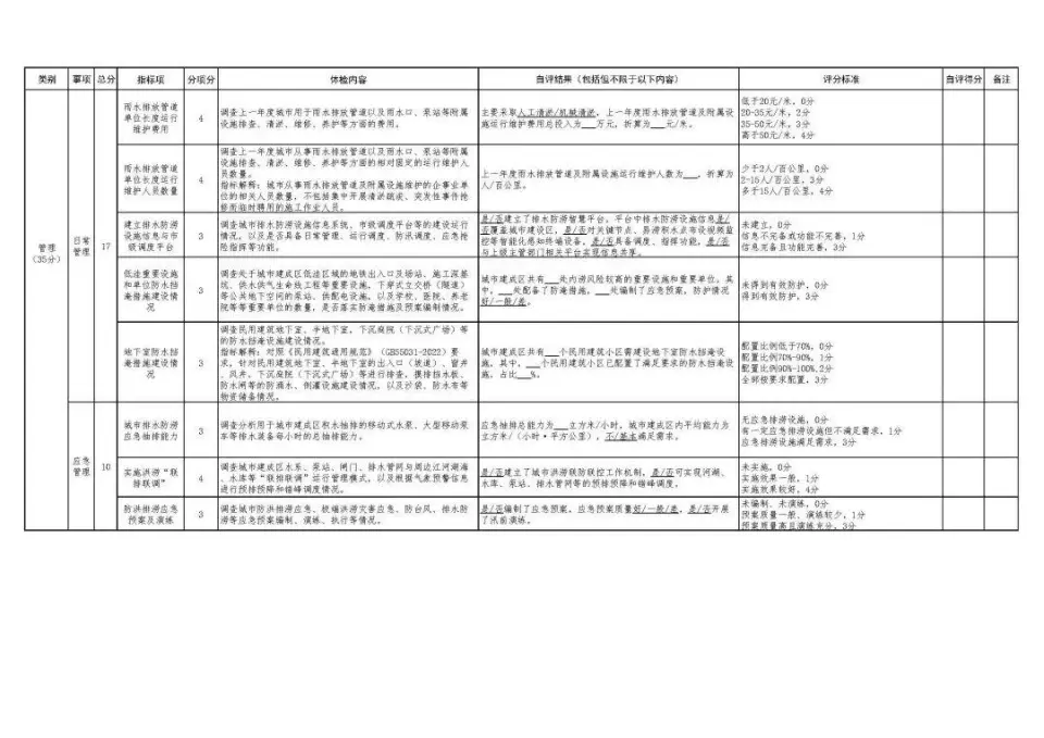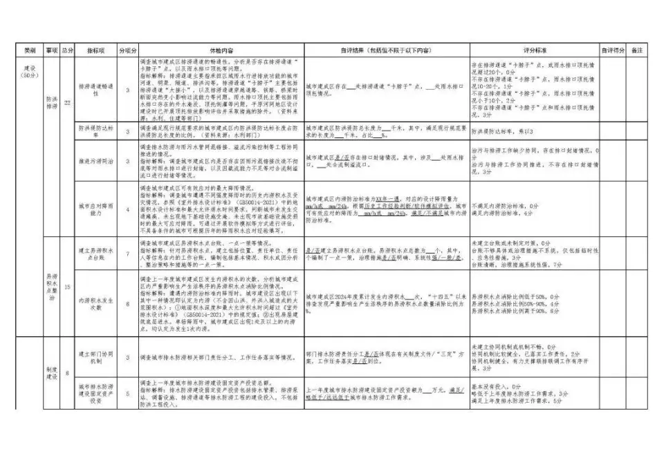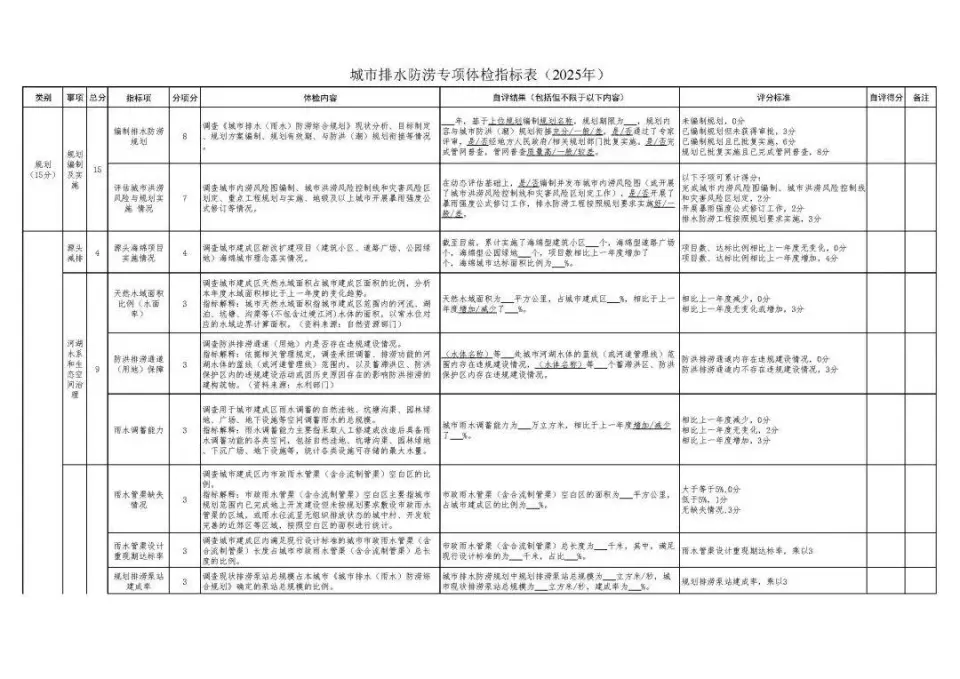 為深入貫徹落實黨中央、國務(wù)院決策部署,建立城市內(nèi)澇治理評估機制,我們在2024年組織開展城市排水防澇專項體檢自評估的基礎(chǔ)上,研究更新了《城市排水防澇專項體檢指標表(2025年)》(見附件,以下簡稱“指標表”),現(xiàn)印發(fā)給你們。請你們結(jié)合2025年汛前準備、隱患排查等工作,組織開展城市排水防澇專項體檢自評估,全面排查城市防洪排澇體系的問題短板和薄弱環(huán)節(jié)。專項體檢要覆蓋全部城市(包括地級及以上城市、縣級市,不含下轄縣、鄉(xiāng)、鎮(zhèn))。針對體檢發(fā)現(xiàn)的問題,屬于本部門的,要明確措施和整改時限,持續(xù)推進解決;需要相關(guān)部門解決的,城市建設(shè)(排水)部門要報告屬地政府,及時反饋和移交。