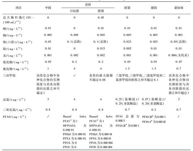 注:?表示美國標(biāo)準(zhǔn)中一種基于健康風(fēng)險(xiǎn)的水質(zhì)目標(biāo)值,是理論上的“無風(fēng)險(xiǎn)”濃度水平,對所有人群(包括敏感人群,如兒童和免疫力低下者)都沒有已知或預(yù)期的健康風(fēng)險(xiǎn);HazardIndexPFAS表示美國標(biāo)準(zhǔn)中20種PFAS化學(xué)物質(zhì)的集合;PFAS-4是指包括PFOA、PFNA、PFHxS和PFOS等4種PFAS化學(xué)物質(zhì)的集合。