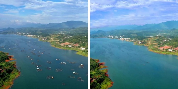 東江湖網箱退水上岸前后對比圖。