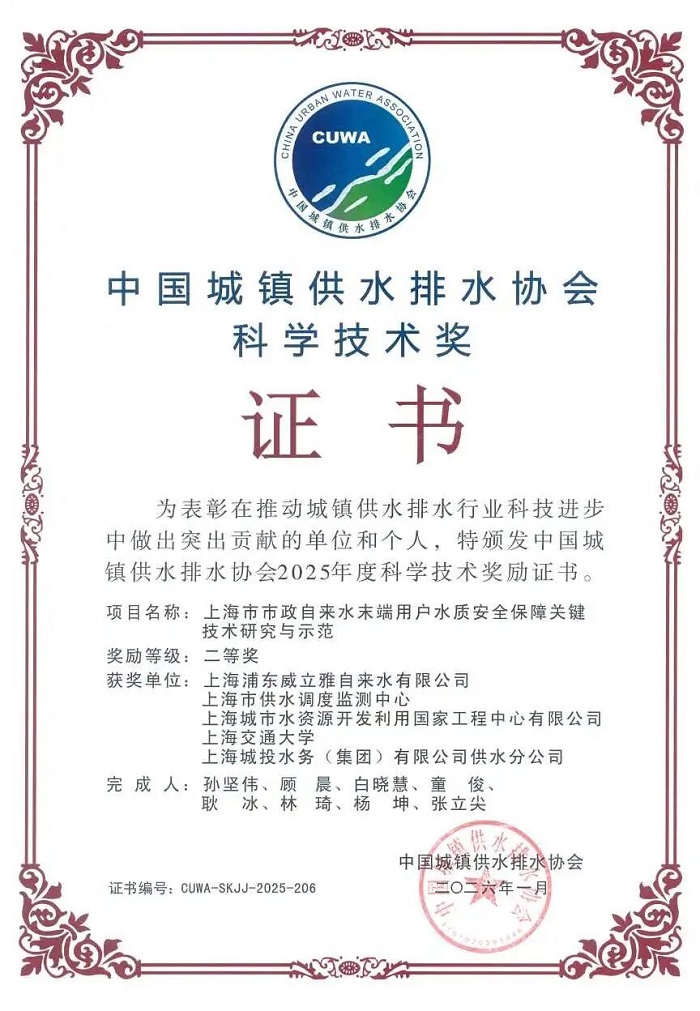 4月16日,2025年度中國城鎮(zhèn)供水排水協(xié)會科學技術(shù)獎頒獎儀式在深圳舉行。上海市供水調(diào)度監(jiān)測中心聯(lián)合上海浦東威立雅自來水有限公司、上海城市水資源開發(fā)利用國家工程中心有限公司、上海交通大學、上海城投水務(wù)(集團)有限公司供水分公司等5家單位完成的項目“上海市市政自來水末端用戶水質(zhì)安全保障關(guān)鍵技術(shù)研究與示范”獲中國城鎮(zhèn)供水排水協(xié)會科學技術(shù)獎二等獎。