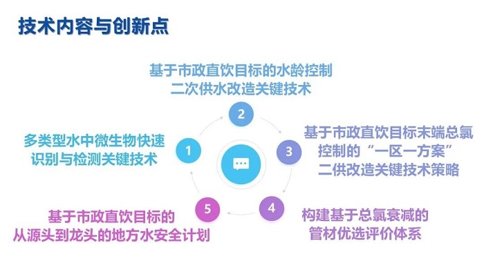 成果內(nèi)容 項目緊扣上海市供水水質(zhì)2035年全面提升并滿足國際先進標準發(fā)展定位,創(chuàng)建基于水齡智能調(diào)控和末端微生物安全的二次供水水質(zhì)安全保障關(guān)鍵技術(shù)體系;開發(fā)適用于飲用水貧營養(yǎng)環(huán)境的菌落總數(shù)檢測新方法,突破水中微生物在線檢測技術(shù);完成原水、水廠、管網(wǎng)、二次供水全流程風險點評估,提出并驗證了以上海市政安全供水為目標的“從源頭到龍頭”的全過程水安全計劃;構(gòu)建基于多水質(zhì)評價指數(shù)的上海市政自來水末端用戶水質(zhì)安全評估技術(shù)體系,技術(shù)成果具有先進性。